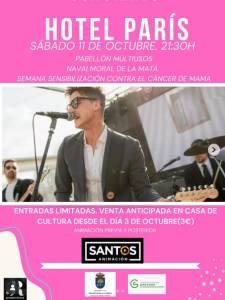 22:30h. Concierto Solidario HOTEL PARÍS. Edificio Multiusos Mª Victoria Villaba. Edificio Multiusos. Entrada anticipada solidaria 2€ .