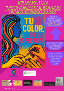 VIII MARATÓN “MECHONES SOLIDARIOS”/UÑAS SOLIDARIAS EN LA LUCHA CONTRA EL CÁNCER. Siendo su objetivo, fomentar la solidaridad entre la población, y que pretende colaborar con la Asociación Mechones Solidarios, que se encarga de elaboración prótesis capilares para enfermos con cáncer.